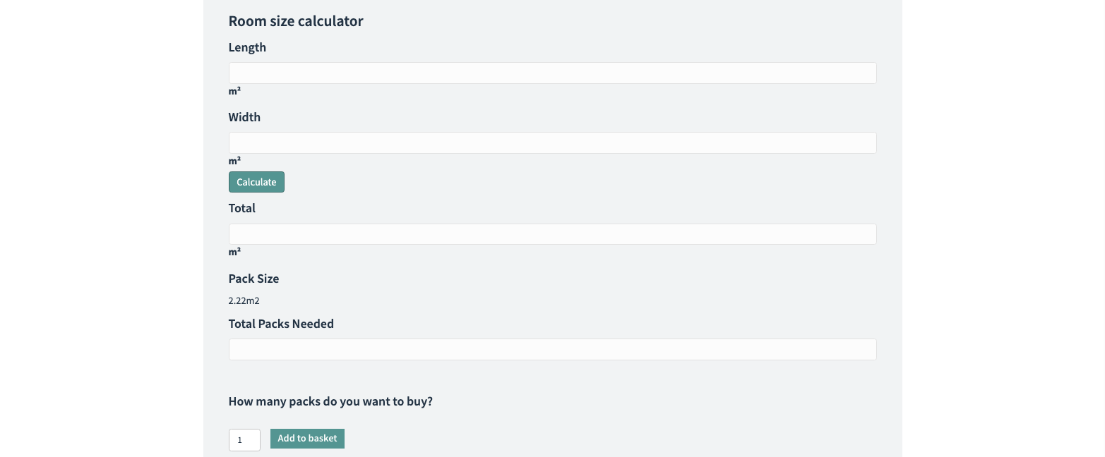 Room size calculator to work out how many packs of flooring the user needs to buy.